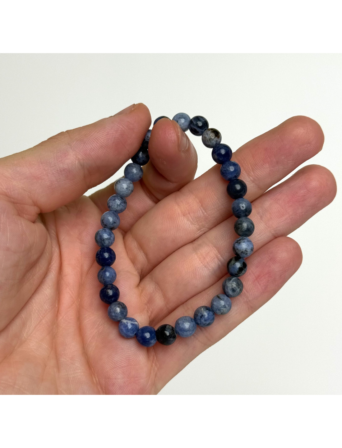 Brățară cu sfere șlefuite de Sodalit pur, fiecare având mărimea de 6mm și un diametru de 6cm, așezate frumos pe un elastic de rezistență maximă, de culoare albastră.